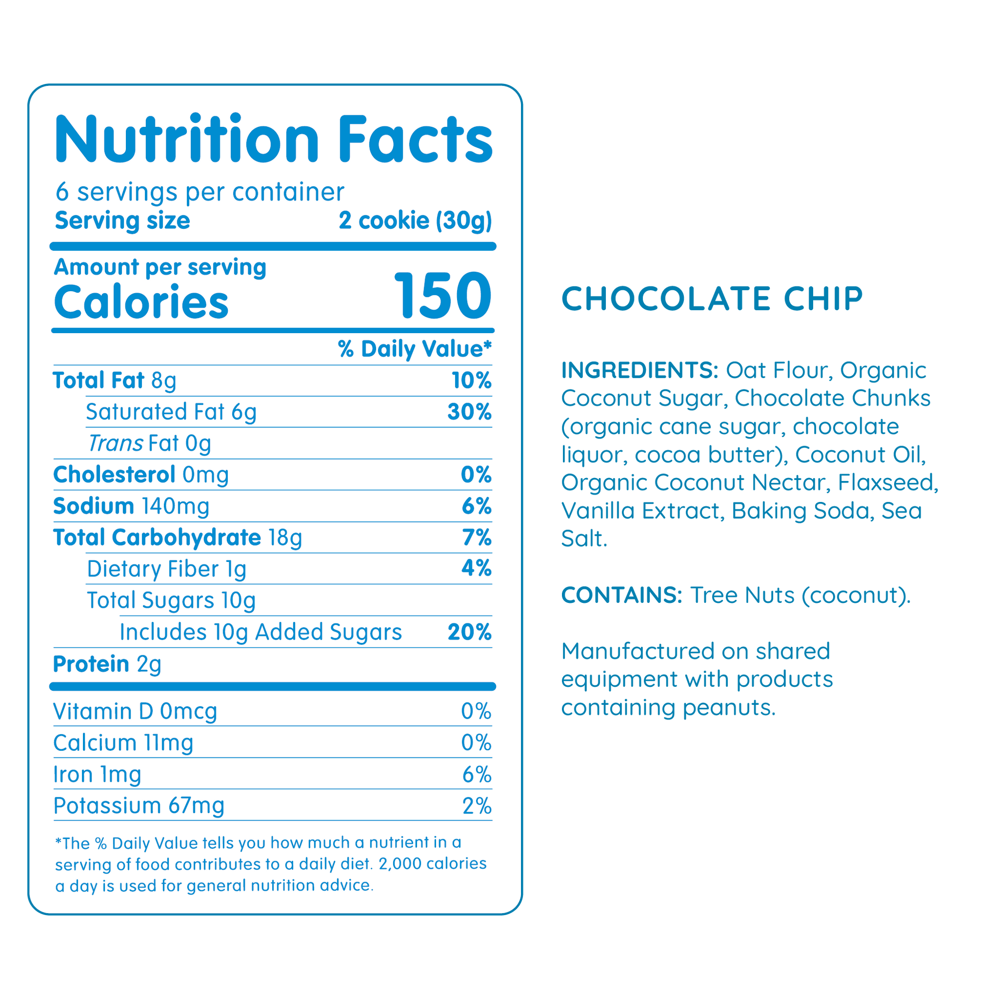 Gluten Free Oat Flour, Organic Coconut Sugar, Chocolate Chunks (organic cane sugar, chocolate liquor, cocoa butter), Coconut Oil, Organic Coconut Nectar, Flaxseed, Vanilla Extract, Baking Soda, Sea Salt.