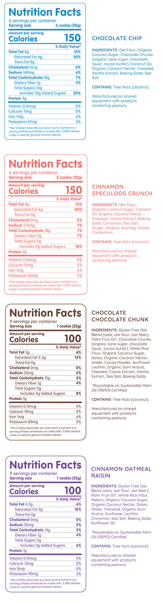 CHOCOLATE CHIP: Oat Flour, Organic Coconut Sugar, Chocolate Chips (organic cane sugar, chocolate liquor, cocoa butter), Coconut Oil, Organic Coconut Nectar, Flaxseed, Vanilla Extract, Baking Soda, Sea Salt.