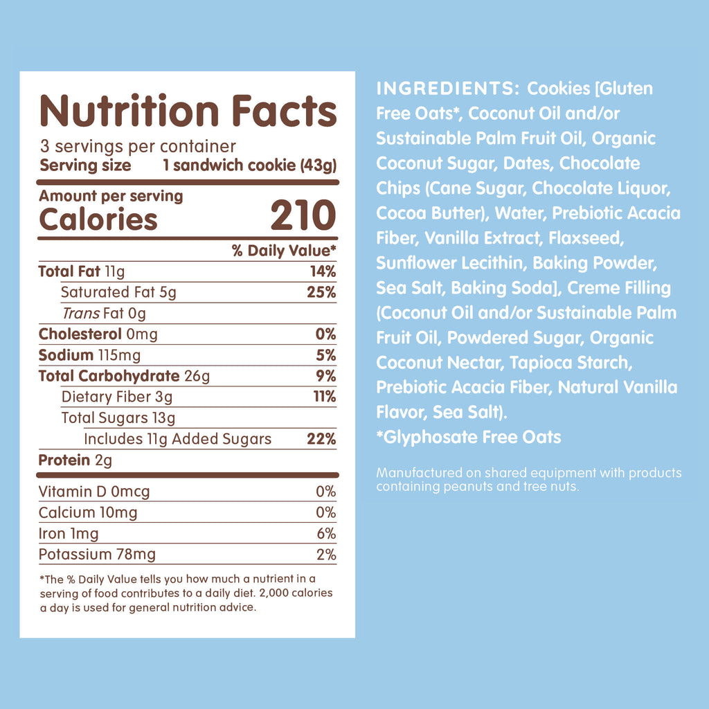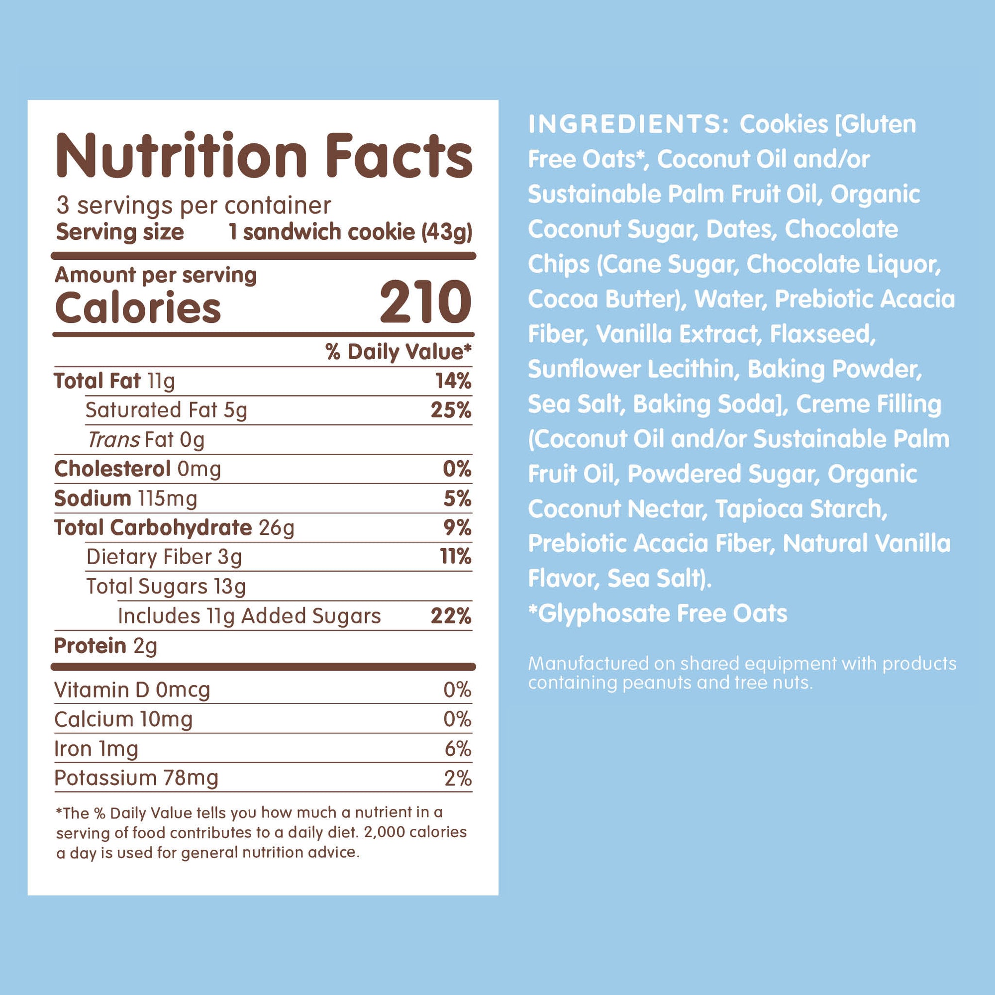 INGREDIENTS: Cookies [Gluten Free Oats*, Coconut Oil and/or Sustainable Palm Fruit Oil, Organic Coconut Sugar, Dates, Chocolate Chips (Cane Sugar, Chocolate Liquor, Cocoa Butter), Water, Prebiotic Acacia Fiber, Vanilla Extract, Flaxseed, Sunflower Lecithin, Baking Powder, Sea Salt, Baking Soda], Creme Filling (Coconut Oil and/or Sustainable Palm