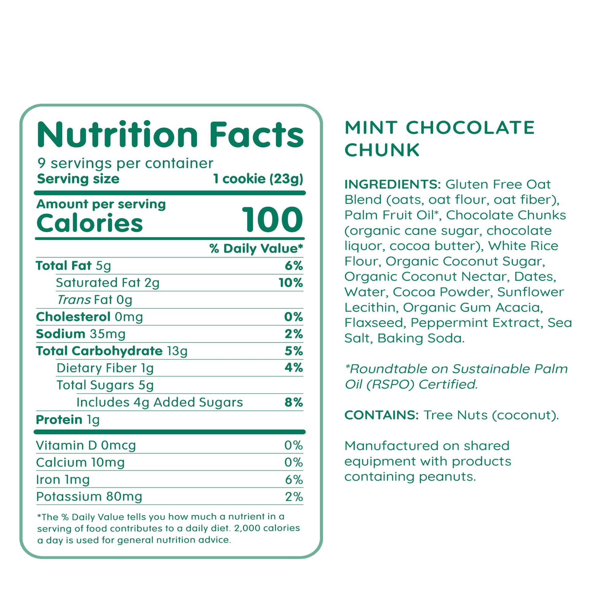 Gluten Free Oat Blend (oats, oat flour, oat fiber), Chocolate Chunks (Organic Cane Sugar, Chocolate liquor, Cocoa Butter), Palm Fruit Oil*, White Rice Flour, Organic Coconut Sugar, Organic Coconut Nectar, Dates, Water, Cocoa Powder, Sunflower Lecithin, Organic Gum Acacia, Flaxseed, Peppermint Extract, Sea Salt, Baking Soda. *Roundtable on Sustainable Palm Oil (RSPO) Certified