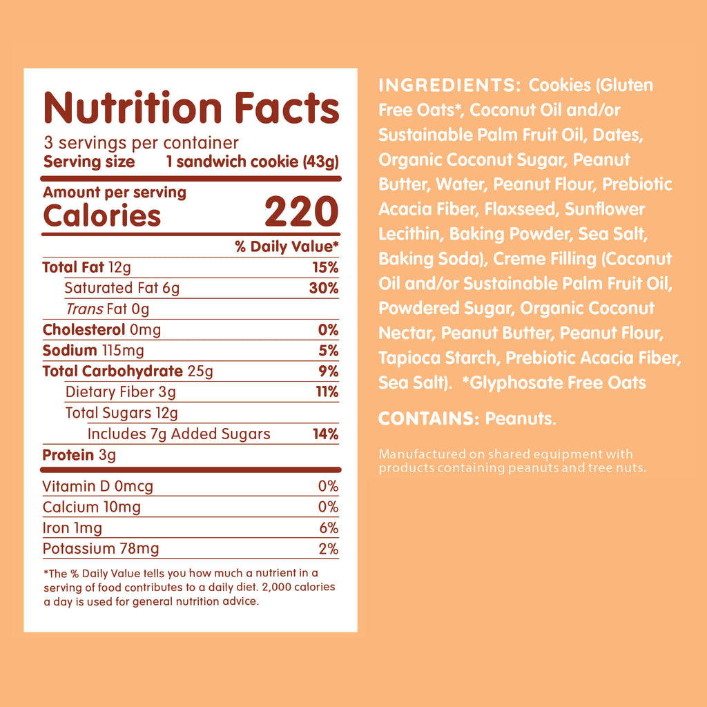Baking Soda), Creme Filling (Coconut Oil and/or Sustainable Palm Fruit Oil, Powdered Sugar, Organic Coconut Nectar, Peanut Butter, Peanut Flour, Tapioca Starch, Prebiotic Acacia Fiber, Sea Salt).