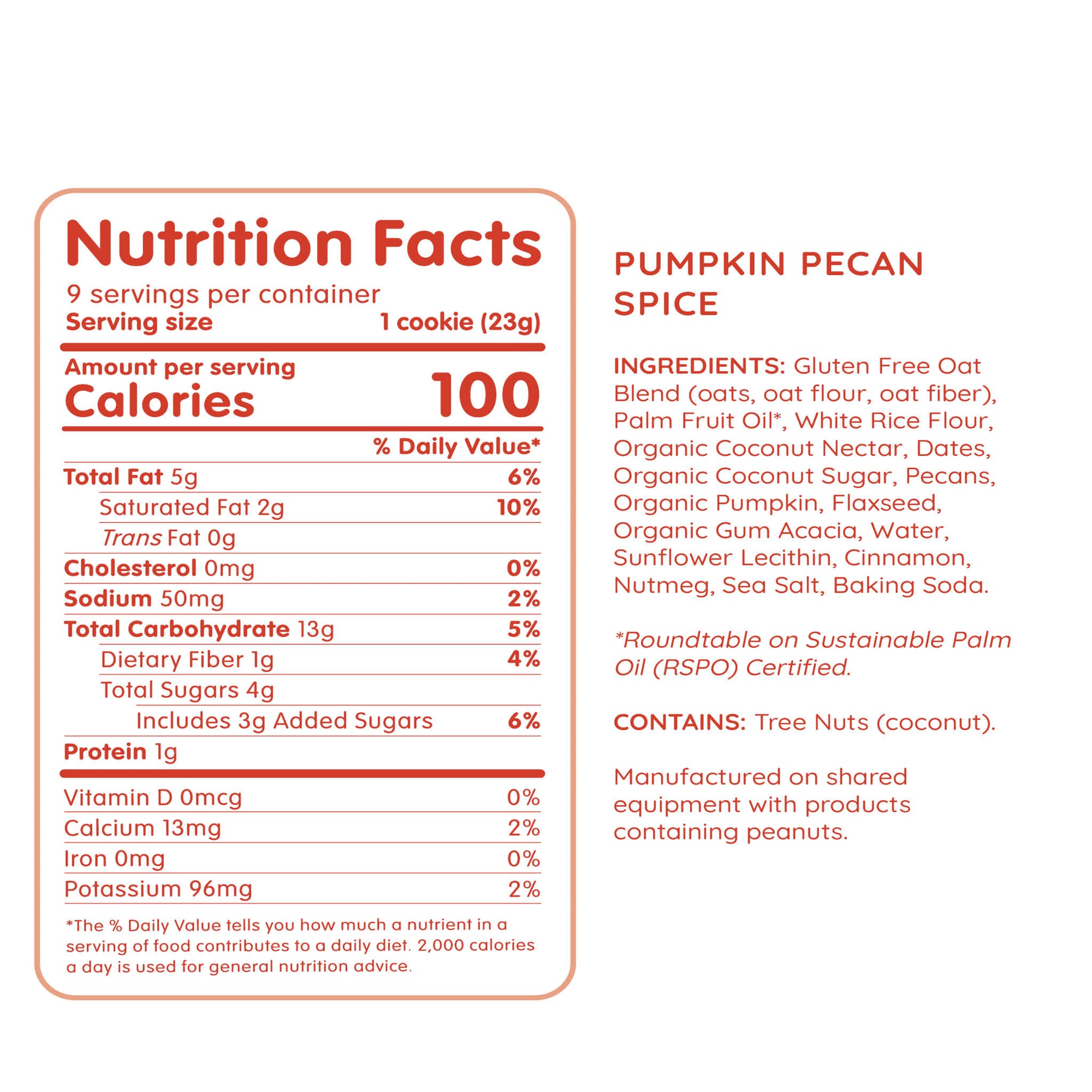 Gluten Free Oat Blend (oats, oat flour, oat fiber), Palm Fruit Oil*, White Rice Flour, Organic Coconut Nectar, Dates, Organic Coconut Sugar, Pecans, Organic Pumpkin, Flaxseed, Organic Gum Acacia, Water, Sunflower Lecithin, Cinnamon, Nutmeg, Sea Salt, Baking Soda. *Roundtable on Sustainable Palm Oil (RSPO) Certified.